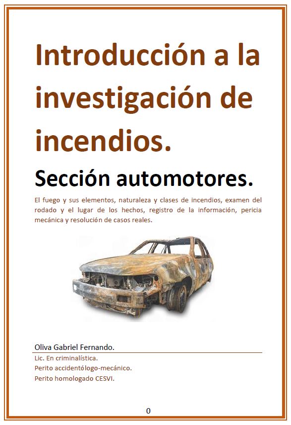 El Licenciado en Criminalística Gabriel Fernando Oliva nos comparte de forma gratuita su libro "Introducción a la investigación de incendios en automotores. Sección automotores".