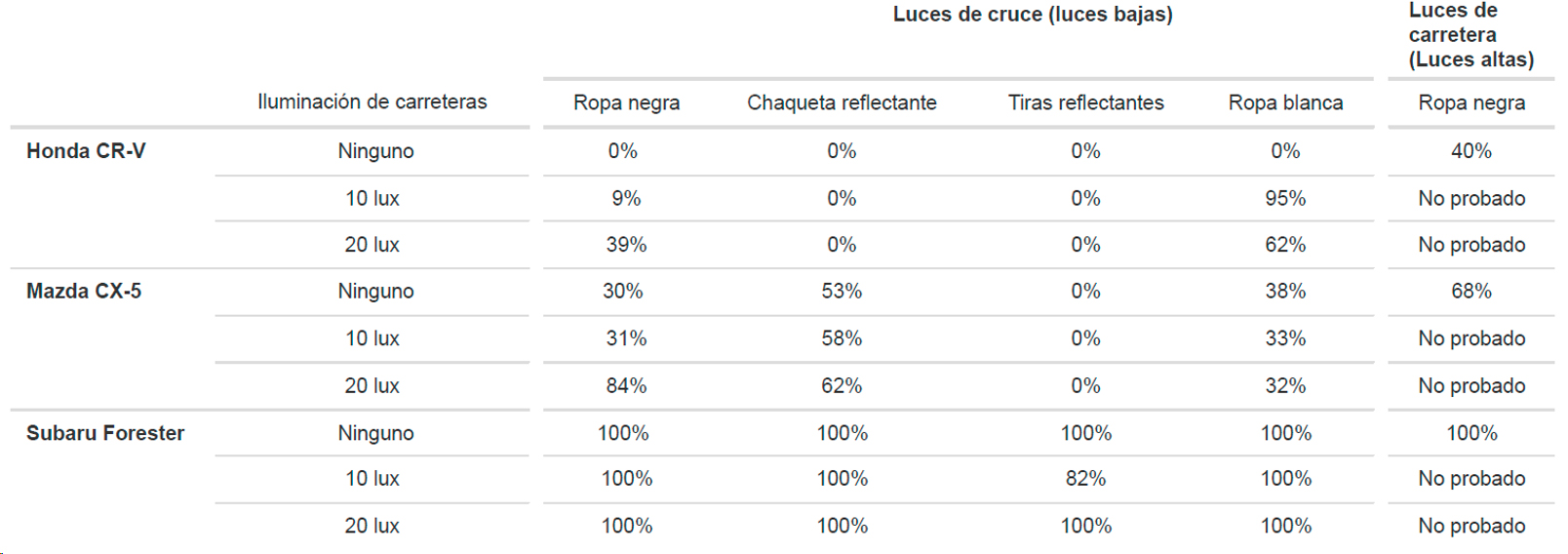 Cuando el maniquí estaba vestido con la chaqueta reflectante, el CR-V no redujo la velocidad en ninguna de las pruebas, sin importar la iluminación adicional en la carretera. En contraste, sin iluminación en la carretera y con 10 lux de luz añadida, el CX-5 redujo mucho más la velocidad de lo que lo hizo cuando el maniquí estaba vestido de negro. Sin embargo, con 20 lux de luz adicional, su rendimiento fue peor con el maniquí en la chaqueta reflectante que cuando llevaba el atuendo negro.