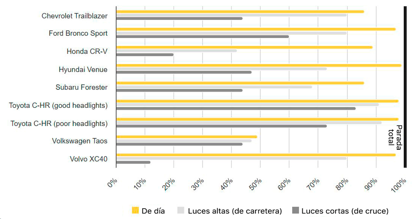 Las pruebas no mostraron una correlación clara entre el rendimiento nocturno y la calidad de los faros. En promedio, los vehículos con faros de calidad buena o aceptable mostraron descensos de rendimiento similares en la oscuridad en comparación con sus resultados diurnos. Los dos vehículos con peor desempeño en la prueba con luces bajas, el Honda CR-V y el Volvo XC40, estaban equipados con faros bien calificados. Por otro lado, el Toyota C-HR, que fue evaluado con faros buenos y malos, superó a todos los demás con luces bajas, incluso cuando tenía faros de baja calidad.